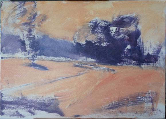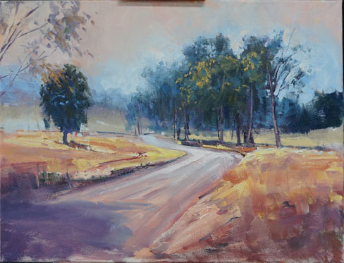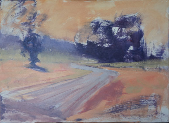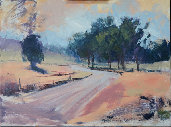 Distant colours The distant grass and road colours were laid in as well as the dark gravel beside the road in the foreground. Red-violet is used to tame down the green. Make sure the brush strokes don't go all the same way.